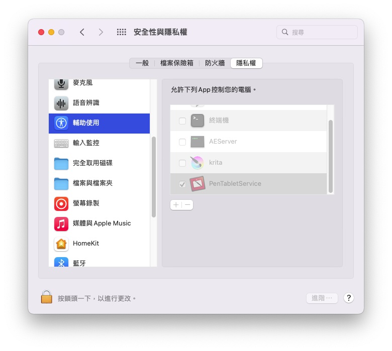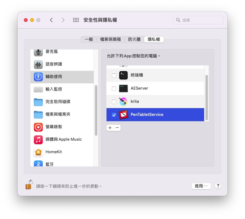 1. 在隱私權頁面,選取”PenTabletService”,按下面”-“的符號,移除”PenTabletService”