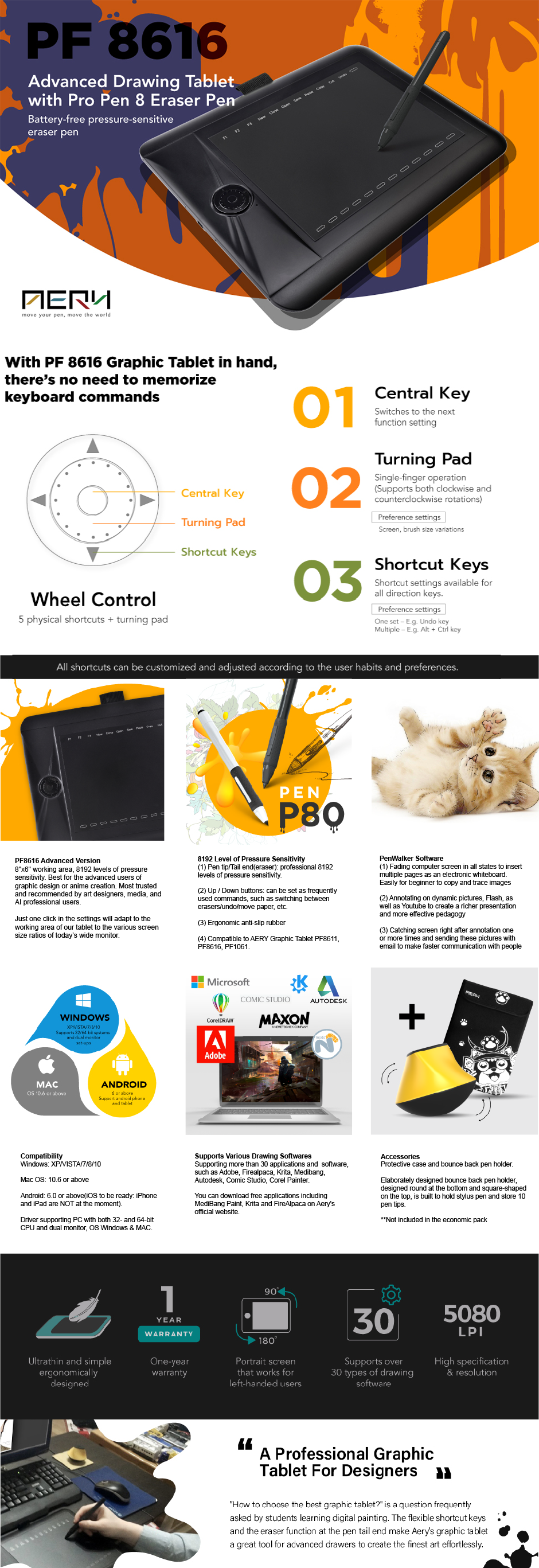 【TABLET】 • Model Number: PF8616 • Active Area: 8.0" x 6.0" • Programmable Hot Keys : 26 • Multifunction Scroll Roller: 1 • Weight: 486g • PC Interface: USB1.1-2.0 • Resolution: 5080DPI • Pressure Sensitivity: 8192 levels • Report Rate: 200 rps • Max Reading Height: 7 mm • Accuracy: ± 0.01"( ±0.25 mm) |